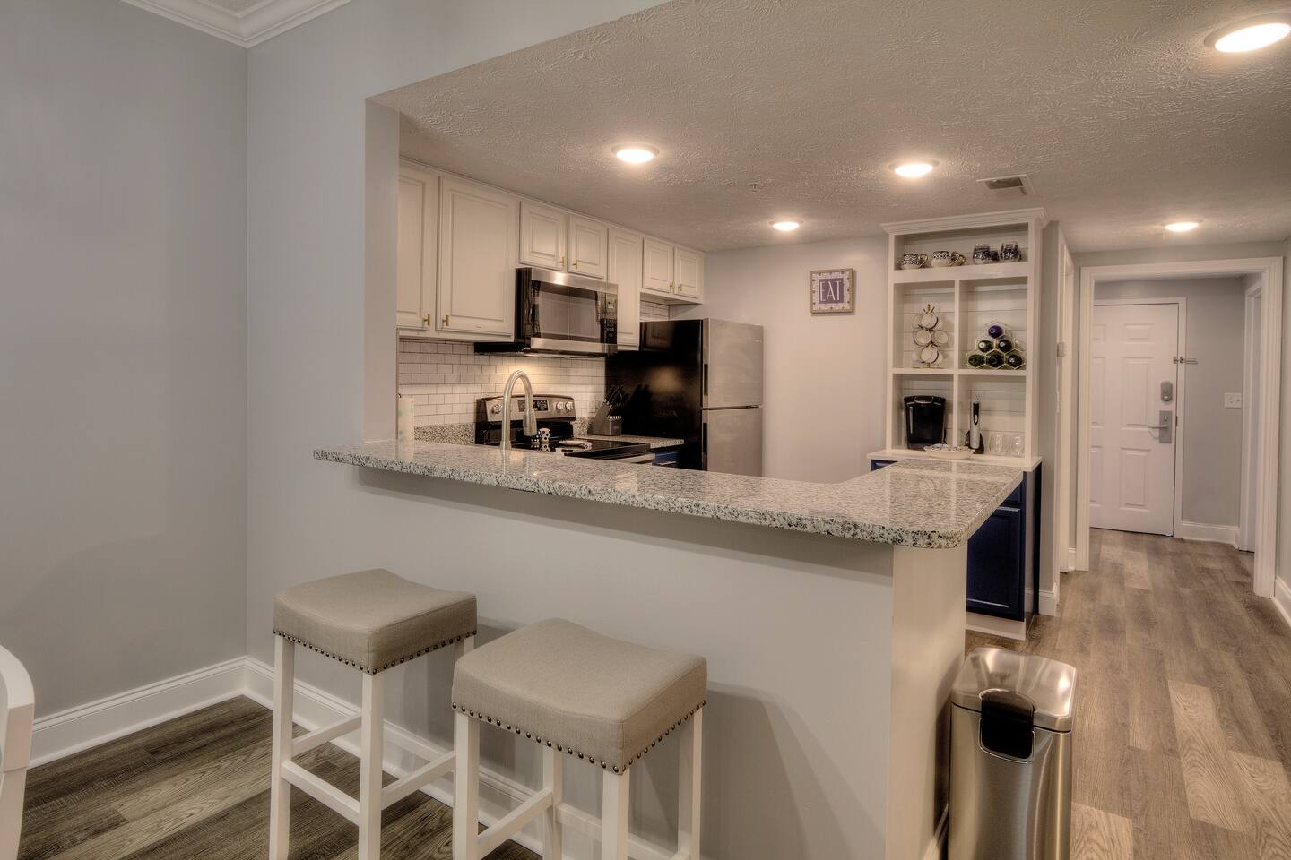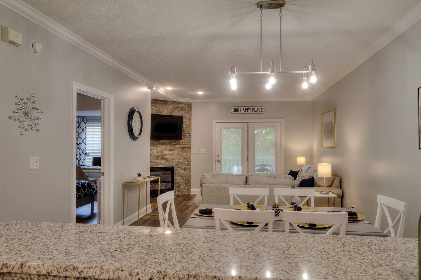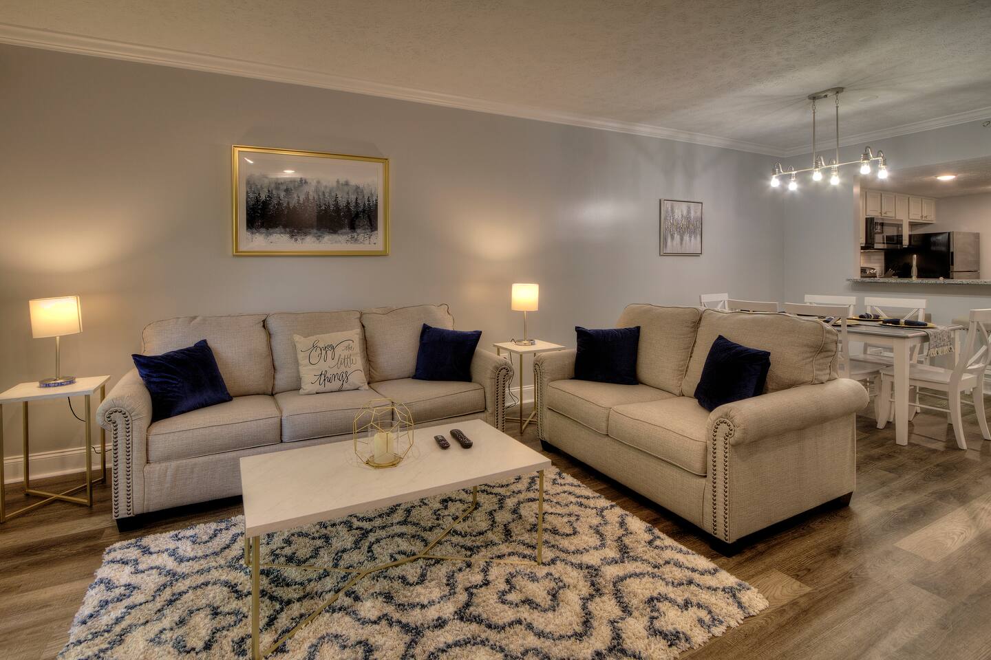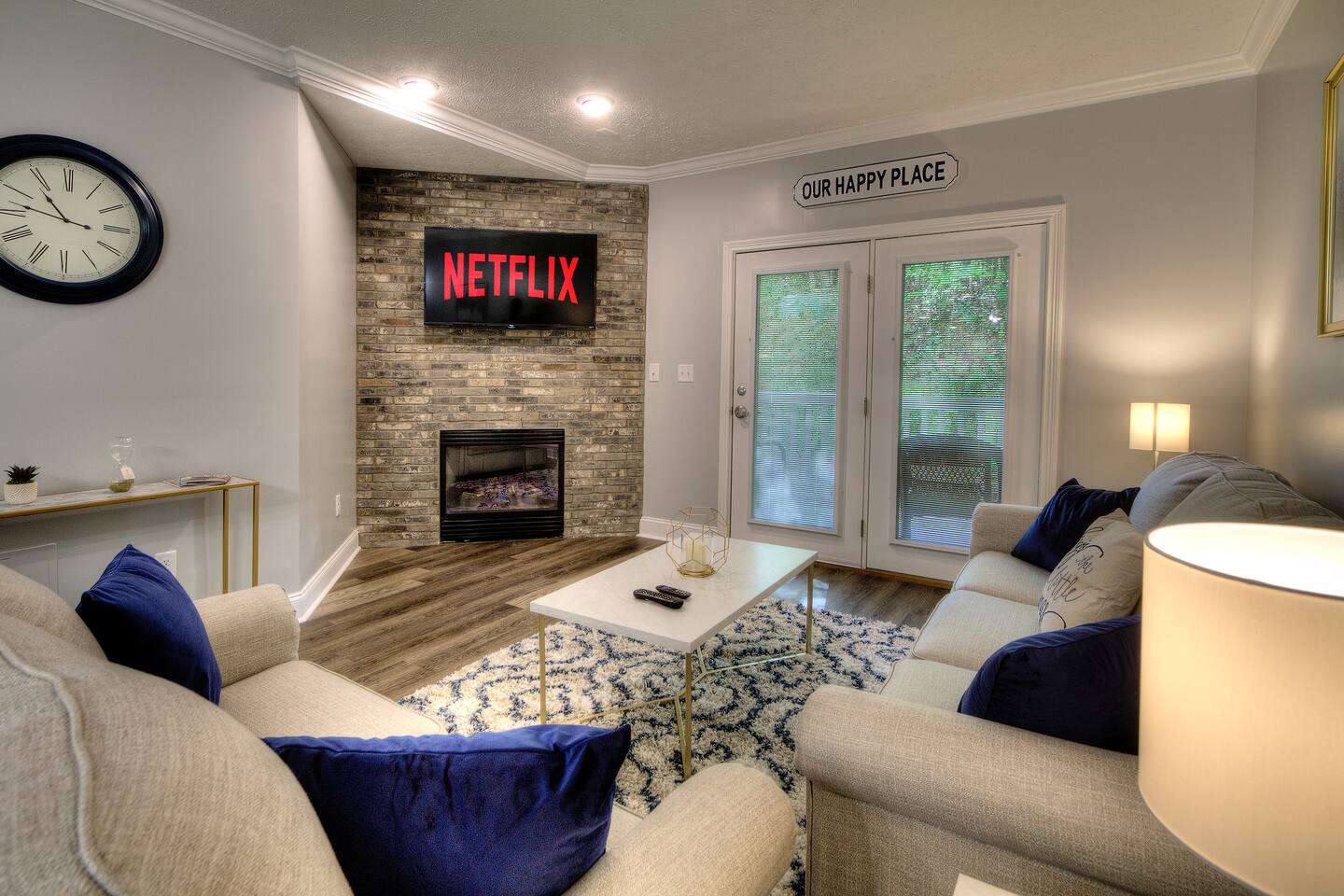 Completely remodeled all new Condo in great location. Close to Dollywood, Ripken, LeConte Center, and everything in Pigeon Forge as well as easy access to Gatlinburg. Fast private high speed internet, HD Cable TV Package, and Free Netflix provided. Kitchen: New granite counter-tops, appliances, cabinets. Full-size refrigerator/freezer, K-Cup Coffee Maker and regular coffee maker, full size stove/oven, full size dishwasher, microwave, toaster, plates, cups, pots, pans, and all basic cookware. Bedroom #1 Spacious Master Bedroom with Queen Bed, Memory Foam mattress, ceiling fan, full guest closet, sitting area with computer desk work space, and 43" HDTV Smart TV. Connects to bathroom #1. Bathroom 1: Large shared bathroom with the living room. Double vanity with make-up station, granite counter-tops, and tiled shower. Towels, hand towels, wash cloths, make up cloths as well as a basic starter set of Shampoo, Conditioner, Lotion, and soap supplied. Bedroom #2 Queen Bed, memory foam mattress, ceiling fan, full closet, private bathroom, 43" HDTV Smart TV. Bathroom 2: Private Bathroom connected to Bedroom #2. Full Bathtub/Shower. Granite countertop vanity. Towels, hand towels, wash cloths, make up cloths as well as a basic starter set of Shampoo, Conditioner, Lotion, and soap supplied. Living Room: Couch and love seat provides seating for a 50" Smart HDTV with Expanded Cable TV and Free Netflix. Beautiful brick fireplace with gas logs, and private balcony that seats 4. Dining Table that seats 6, as well as granite counter-top bar that sits 2 more(seats 8 comfortably)