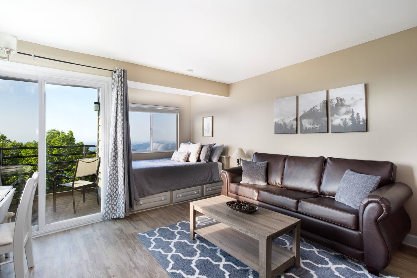 Located at 3,000ft Gatlinburg Summit has unrivaled Smoky Mountain views. Our newly remodeled mountain Studio includes a private balcony with mountain and valley views, a real wood burning fireplace, comfortable furnishings, newly remodeled kitchen w/ granite countertops, expanded Cable w/HBO, private High-Speed WiFi, New memory foam Queen Bed, and new couch with memory foam queen sleeper. On site outdoor & indoor pool, two hot tubs, clubhouse, playground, and picnic/grill area.
