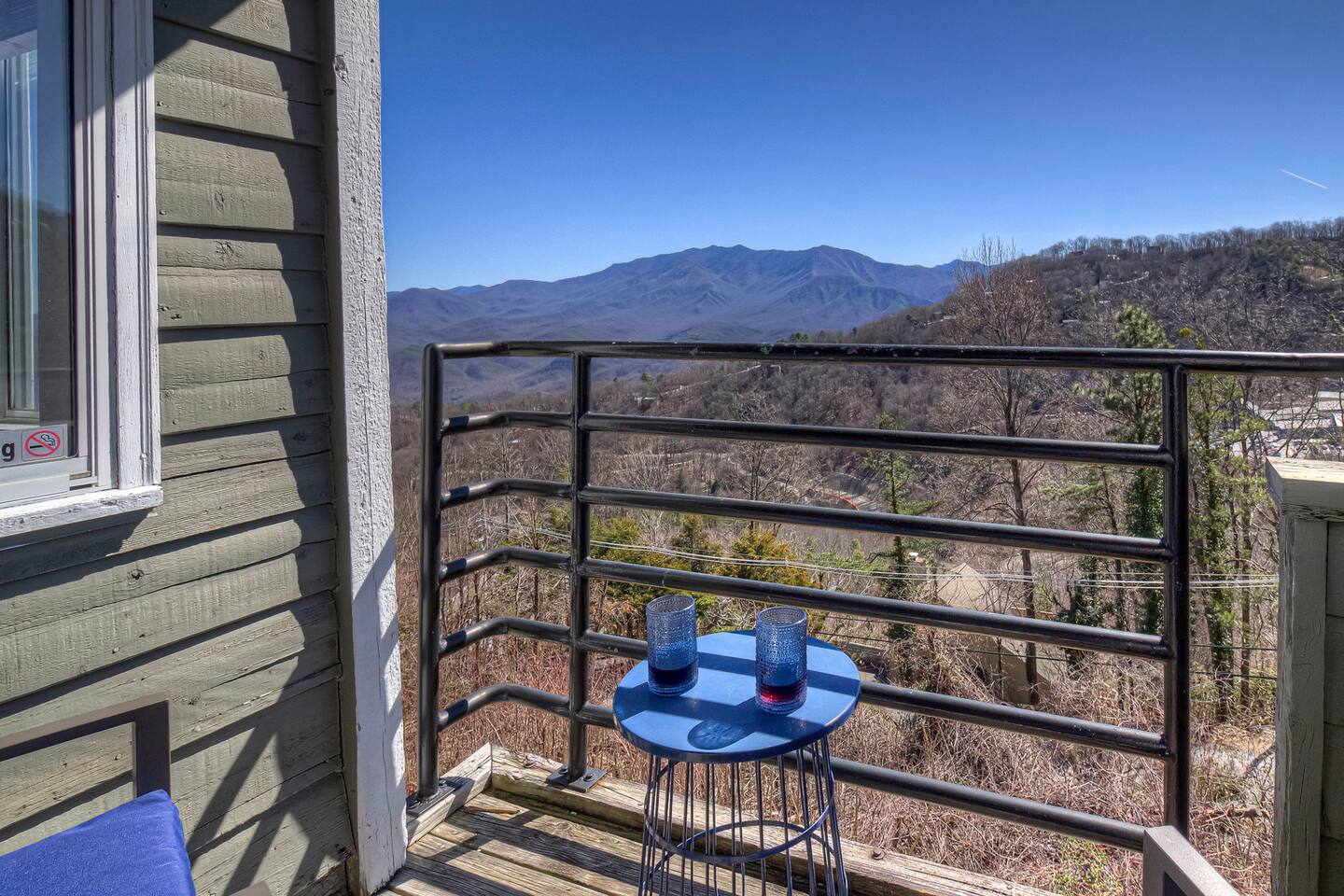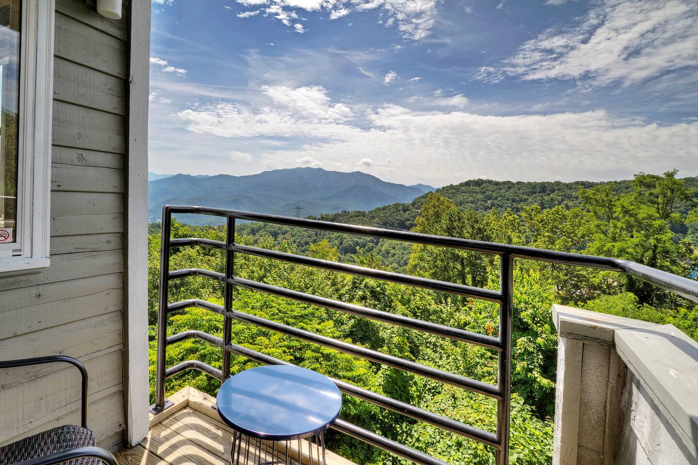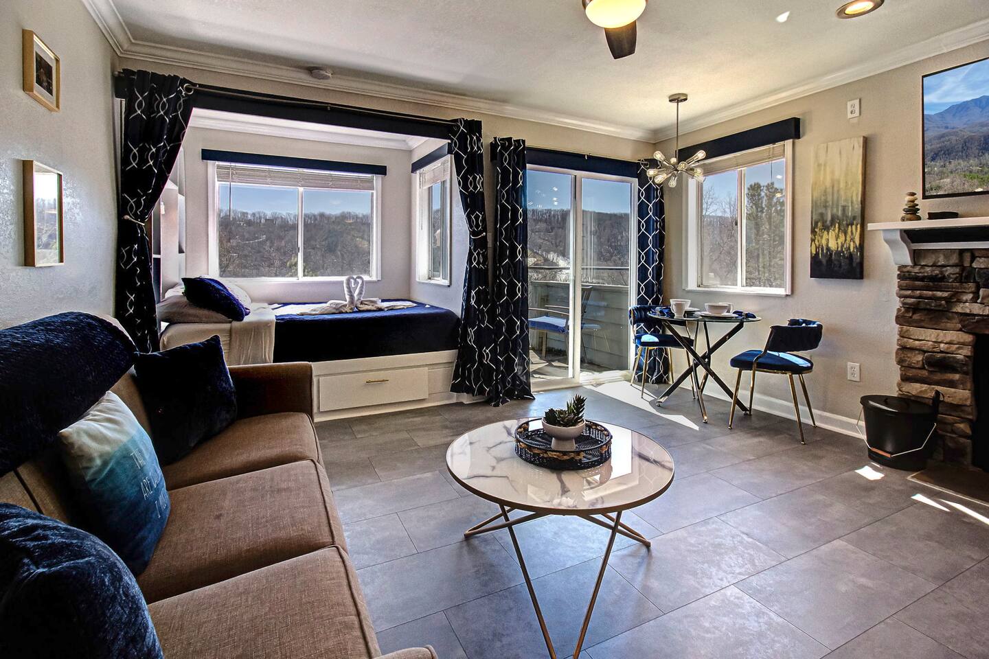 *NEW Remodel 3/1/25* Located at 3,000ft Gatlinburg Summit has unrivaled Smoky Mountain views. Our newly remodeled modern Studio includes a private balcony with incredible views of Mt. Leconte, a real wood burning fireplace, new furnishings, newly remodeled kitchen w/ granite countertops, Expanded Cable w/HBO, private High-Speed WiFi. Memory foam Queen Bed, and couch with memory foam queen sleeper. On site outdoor & indoor pool, two hot tubs, clubhouse, playground, and picnic/grill area.