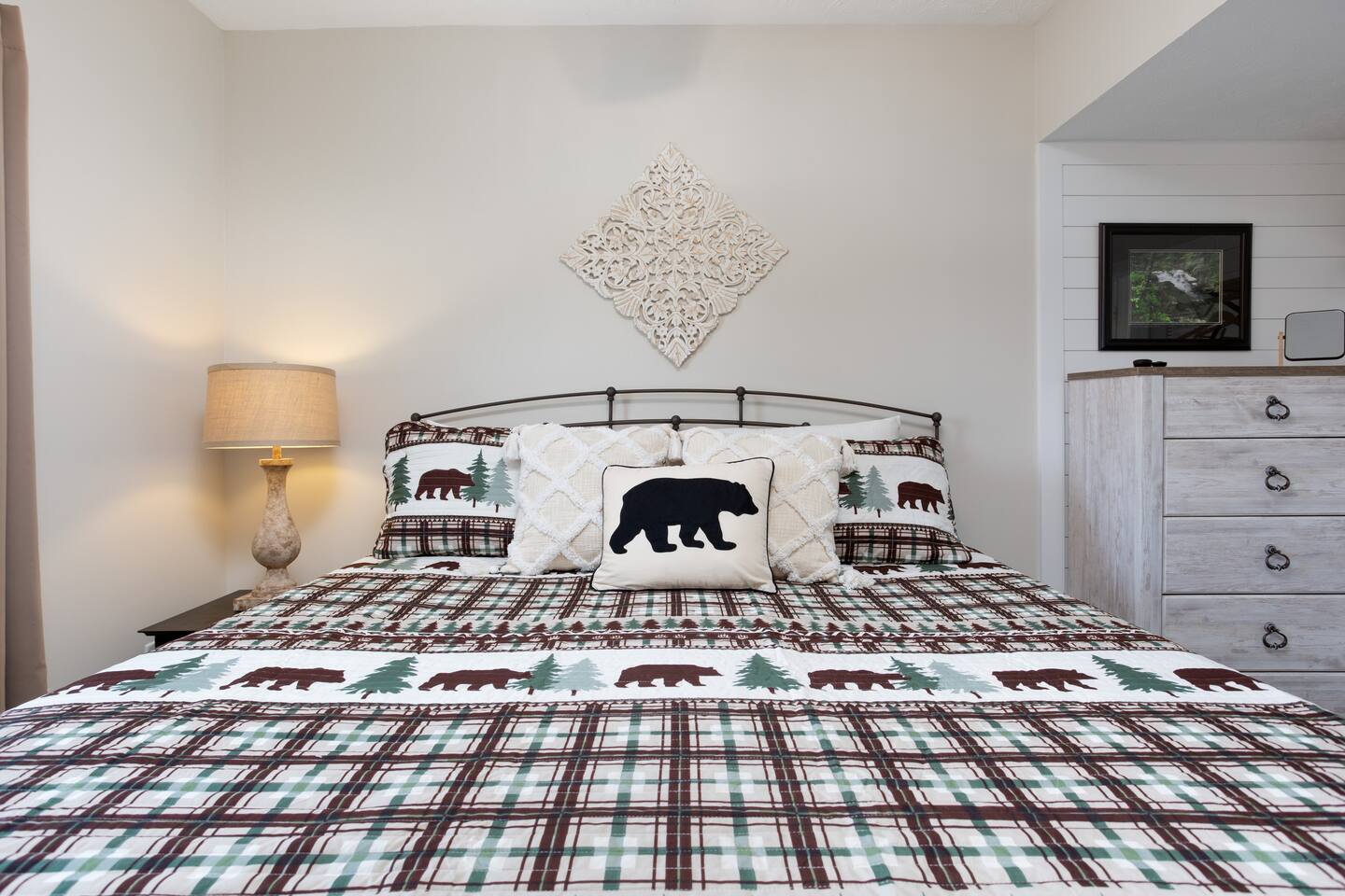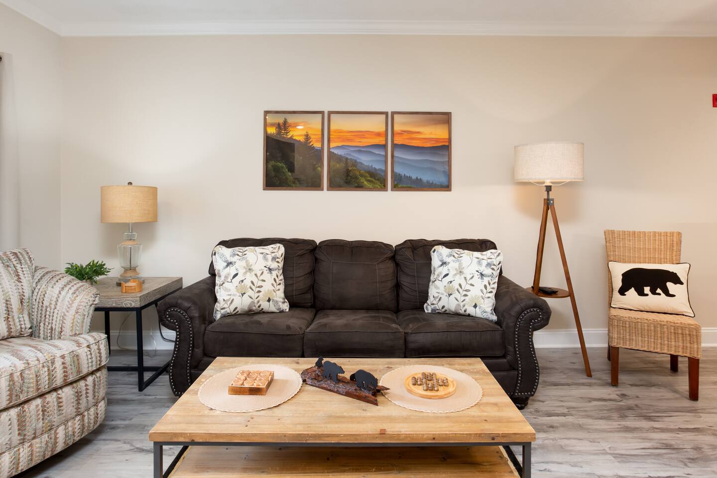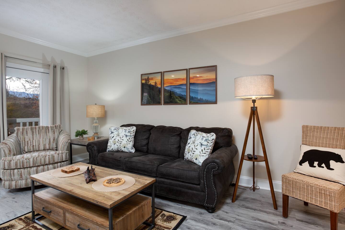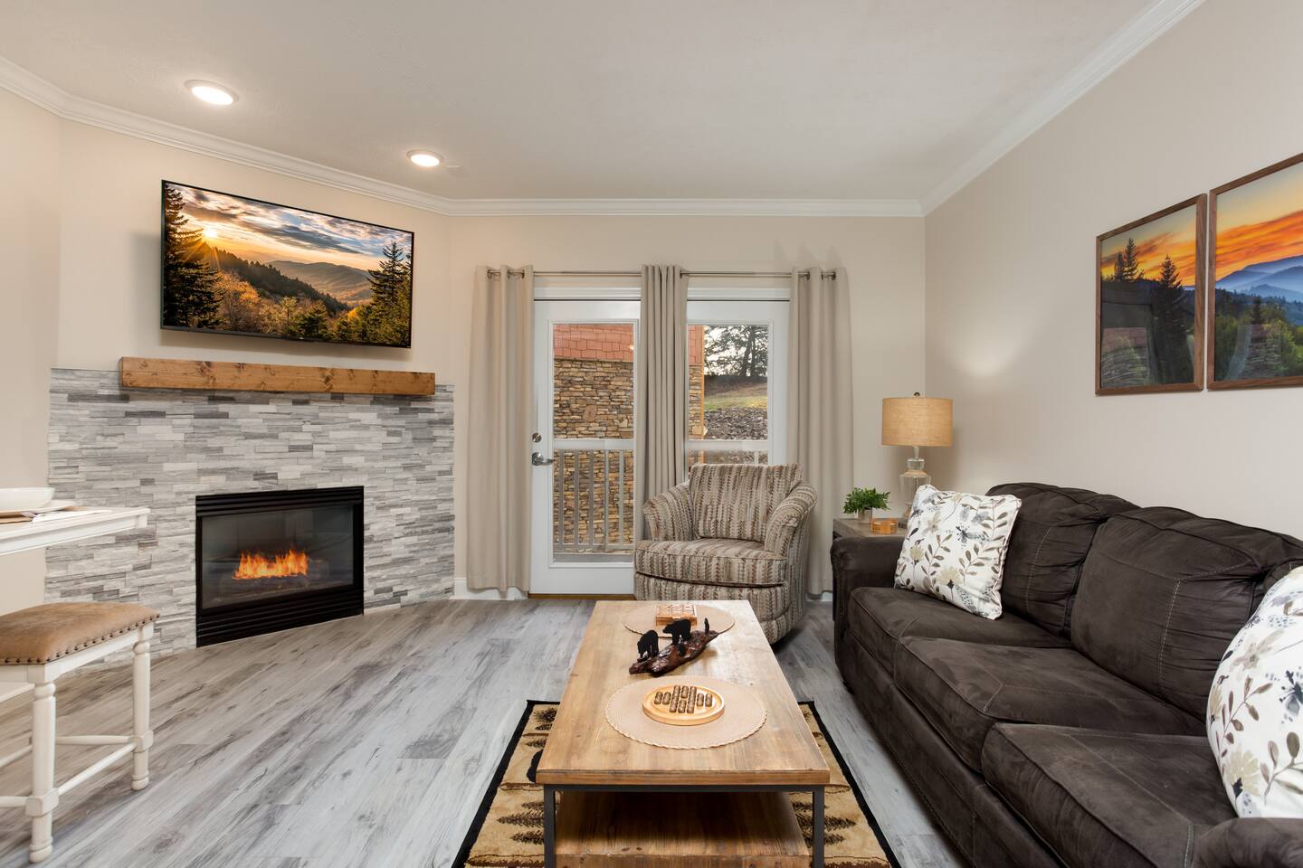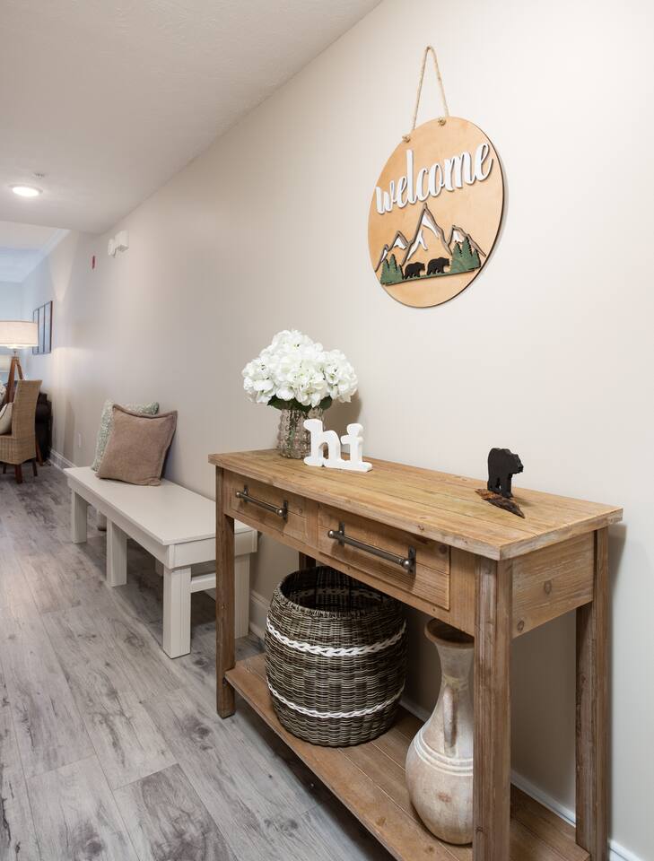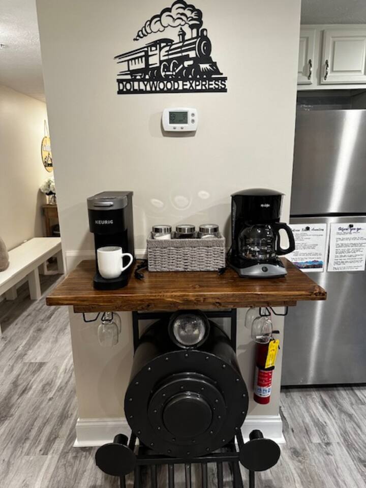 **Book this newly remodeled condo with confidence today. Hosted by SuperHost (Matt) with over 4,000+ 5 star reviews. Now this already incredible condo has been recently refreshed with a nice remodel and is even better. We are excited to Host new guests in our welcoming condo.** Newly Remodeled Condo with a Smoky Mountain Theme. Numerous amenities for the whole family including: Outdoor Swimming Pool, Indoor Swimming Pool, Outdoor Hot Tub, Covered Outdoor Kitchen, Picnic Area w/Grills. The location is within minutes of Dollywood, Pigeon Forge Attractions, Gatlinburg, Great Smoky Mountains, Gatlinburg Public Golf Course, Pigeon Forge Parkway, Cal-Ripken Field & Sports Complex, LeConte Convention Center, Wonderful Dining Experiences and Shopping Opportunities Galore! Not only is the condo conveniently located, there is a public transit stop if you decide to park and ride the trolley. Our condo is located on the 2nd floor of the complex with a convenient elevator down the hallway. THE KITCHEN: Fully equipped kitchen with pots and pans, cooking utensils, new plates, bowls, coffee cups, and basic cookware. Stainless Steel Full-Size Appliances. Coffee Bar available - “Dollywood Express Inspired” with your choice of K-cup or Mr. Coffee Maker. Kitchen Starter set includes: Coffee, Creamer, Sugar, Kitchen Towel, Kitchen Wash Rag, Sponge, and Dishwasher Pod. THE BEDROOM: Spacious Bedroom with Luxury Hybrid Memory Foam Mattress (King), Ceiling Fan w/remote control, plenty of storage for guest clothing (chest of drawers or hanging items) and make-up mirror. Connecting door to bathroom. BEDROOM TV 50” Roku & Xfinity Cable TV, Luggage Racks for Suitcases. THE BATHROOM: Tub/Shower Combo. Bathroom is furnished with Bath Towels, Hand Towels, Wash Cloths, and Hair Dryer. Bathroom Starter set includes: Hand Soap, Shampoo, and Conditioner. THE LIVING ROOM: Open space designed Living Room includes 55” Ultra High-Definition Roku TV mounted above the stone fireplace and Xfinity Cable TV. The Dining Area is open to the Kitchen with access to the Balcony. Balcony includes Table and 2 Chairs. Also, the Living Room includes a Queen Sleeper Sofa with memory foam mattress which allows room for additional guests to sleep. Playing Cards, Pigeon Forge Puzzle, and other Games are in the condo for a fun game night! The games are located on the coffee table and also in the drawers of the coffee table. Condo includes: Luxury vinyl plank / luxury finishes throughout (no carpet) Granite counter tops Newly Painted throughout Complete remodel Smoky Mountain / Dollywood Express theme on Dollywood Lane Fast High-speed internet (private) Gas fireplace in the Living Room - NEW 4K Ultra High Definition TV's. Xfinity HD cable Living Room TV - 55” Roku for Streaming Bedroom TV - 50” Roku for Streaming High Speed Xfinity Internet for those that need to Work Washer / Dryer (free in unit)