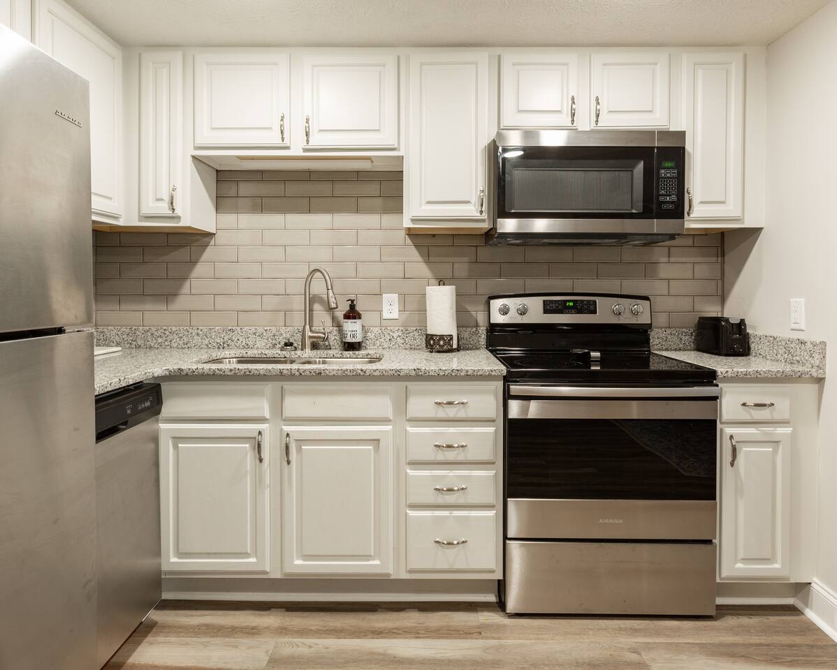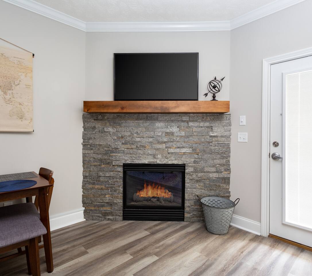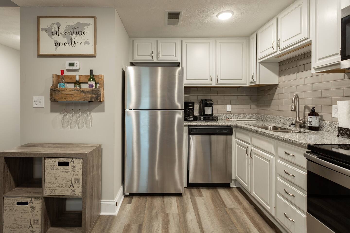 Fully remodeled Condo in a great location on Dollywood Lane. Close to Dollywood, Ripken, LeConte Center, and everything in Pigeon Forge as well as easy access to Gatlinburg. Kitchen: New granite counter-tops, appliances, cabinets. Full-size refrigerator/freezer, icemaker, K-Cup Coffee Maker and regular coffee maker, full size stove/oven, full size dishwasher, microwave, toaster, plates, cups, pots, pans, and all basic cookware. Bedroom: Spacious Bedroom with comfy King Bed, guest closet, HDTV Smart TV, and sitting area. Connects to bathroom. Bathroom: Granite counter-top, with new vanity. Towels, hand towels, wash cloths, as well as a basic starter set of Shampoo, Conditioner, Lotion, and soap supplied. Living Room: Smart HDTV with expanded HD Cable. Stacked stone fireplace and mantle with gas logs. Fold out couch with queen memory fold bed. Private patio off of living room. 4 person dining table to eat dinners in unit.