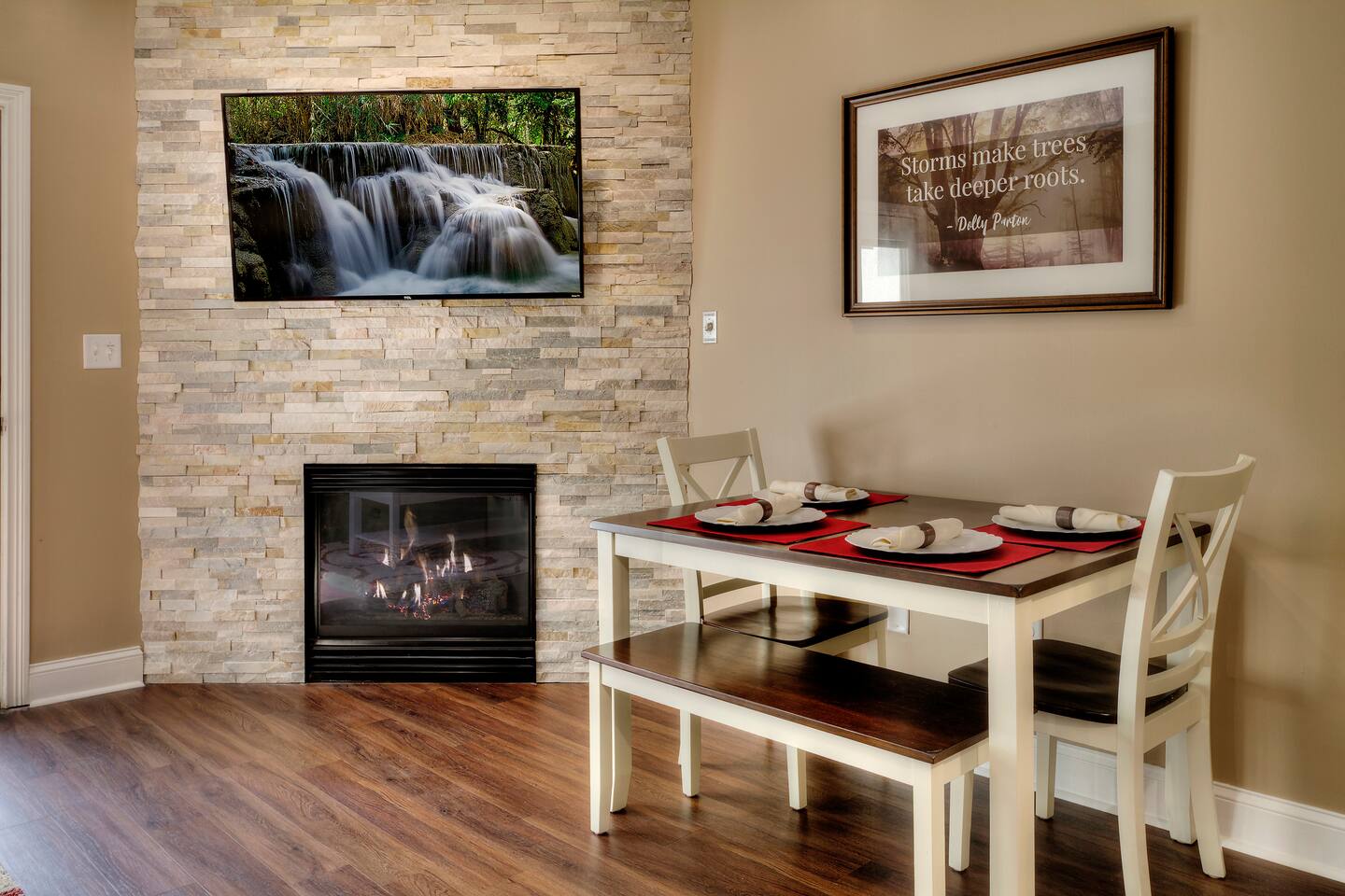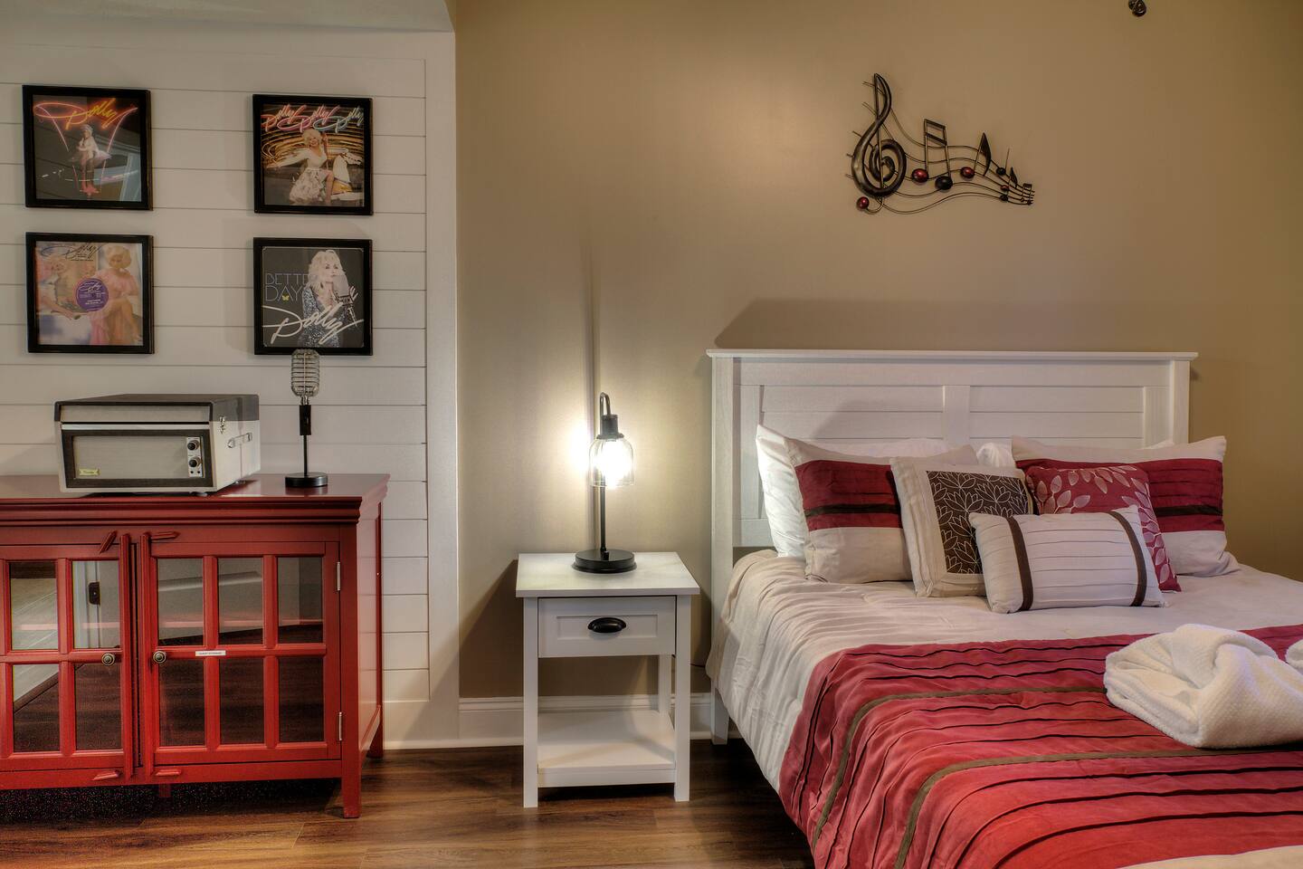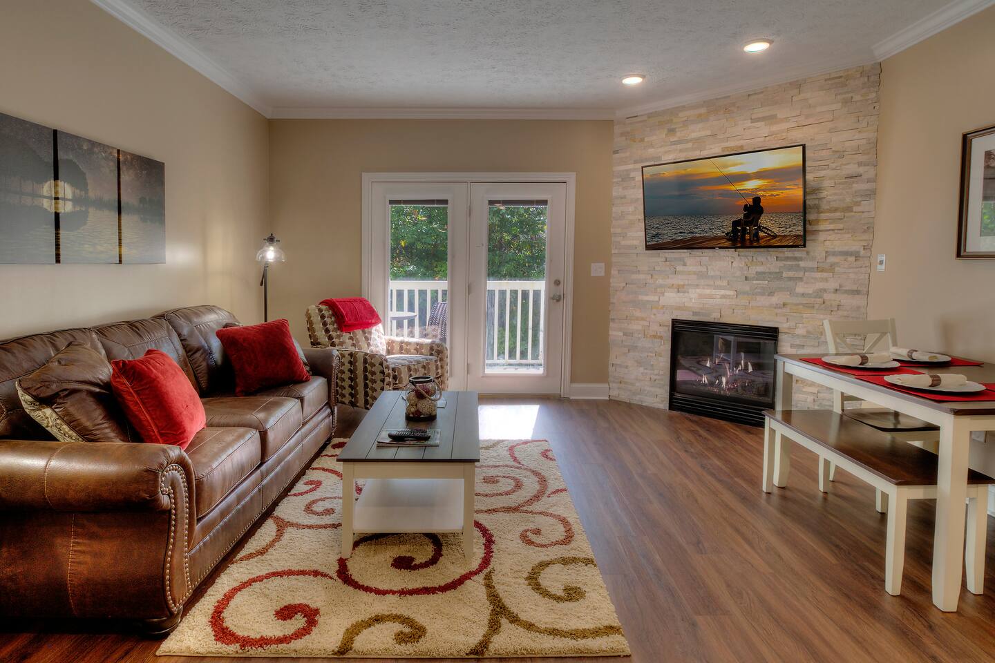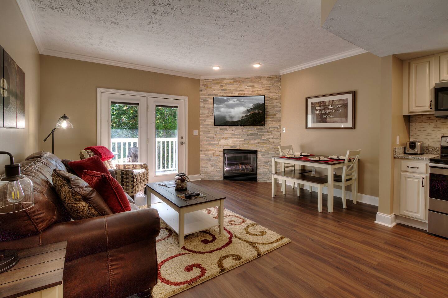 Completely remodeled all new Dolly-inspired Condo in a great location on Dollywood Lane. Close to Dollywood, Ripken, LeConte Center, and everything in Pigeon Forge as well as easy access to Gatlinburg. Fast private high speed internet, HD Cable TV Package. Kitchen: New granite counter-tops, appliances, cabinets. Full-size refrigerator/freezer, icemaker, K-Cup Coffee Maker and regular coffee maker, full size stove/oven, full size dishwasher, microwave, toaster, plates, cups, pots, pans, and all basic cookware. Bedroom: Spacious Bedroom with Queen Bed, Luxury Hybrid Memory Foam mattress(new mattress 11/27/23), ceiling fan, guest closet, 43" HDTV Smart TV, Bluetooth record player to play all your favorite music. Connects to bathroom. Bathroom: Granite counter-top, large tiled shower, with sliding glass doors. Towels, hand towels, wash cloths, make up cloths as well as a basic starter set of Shampoo, Conditioner, Lotion, and soap supplied. Living Room: 55" Smart HDTV with expanded HD Cable. Gorgeous stone fireplace with gas logs. Fold out couch with queen memory fold bed. Private patio off of living room.