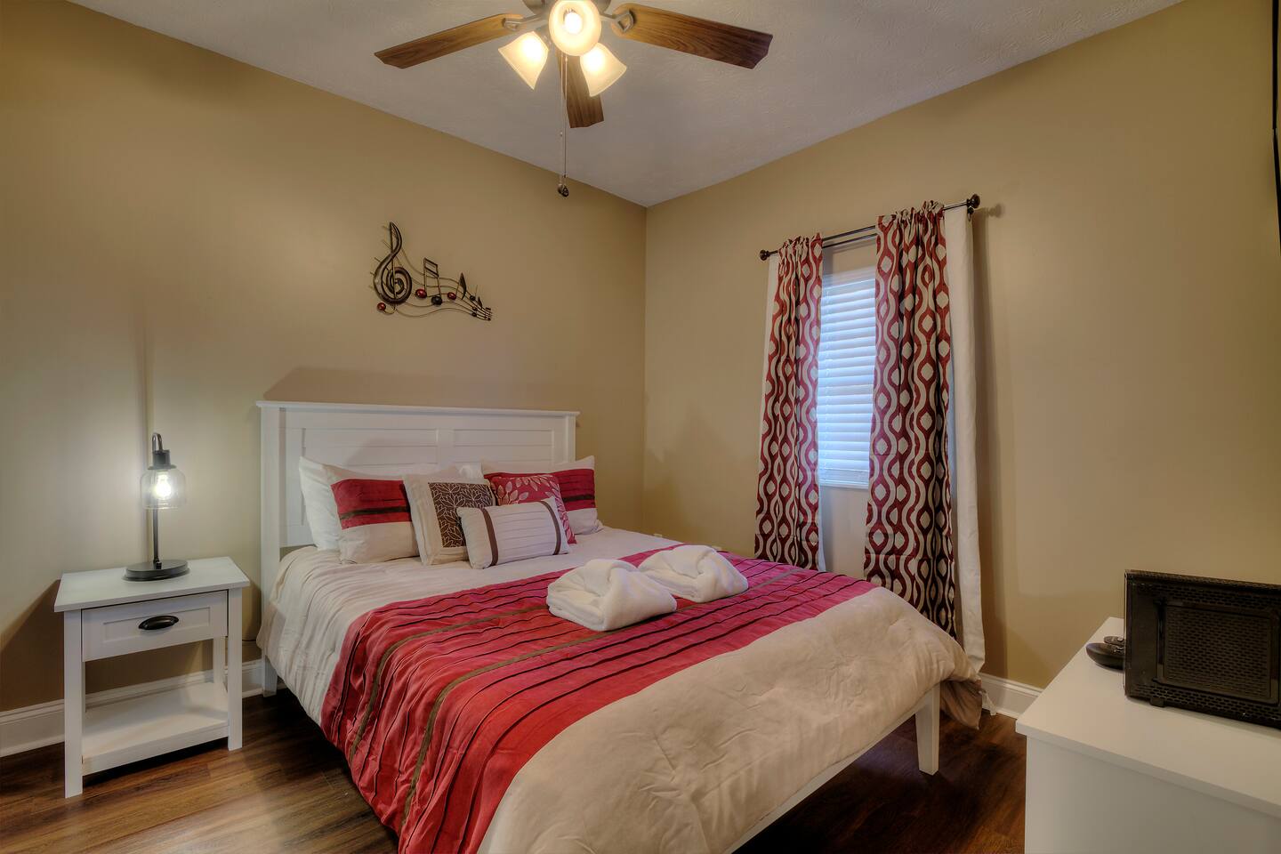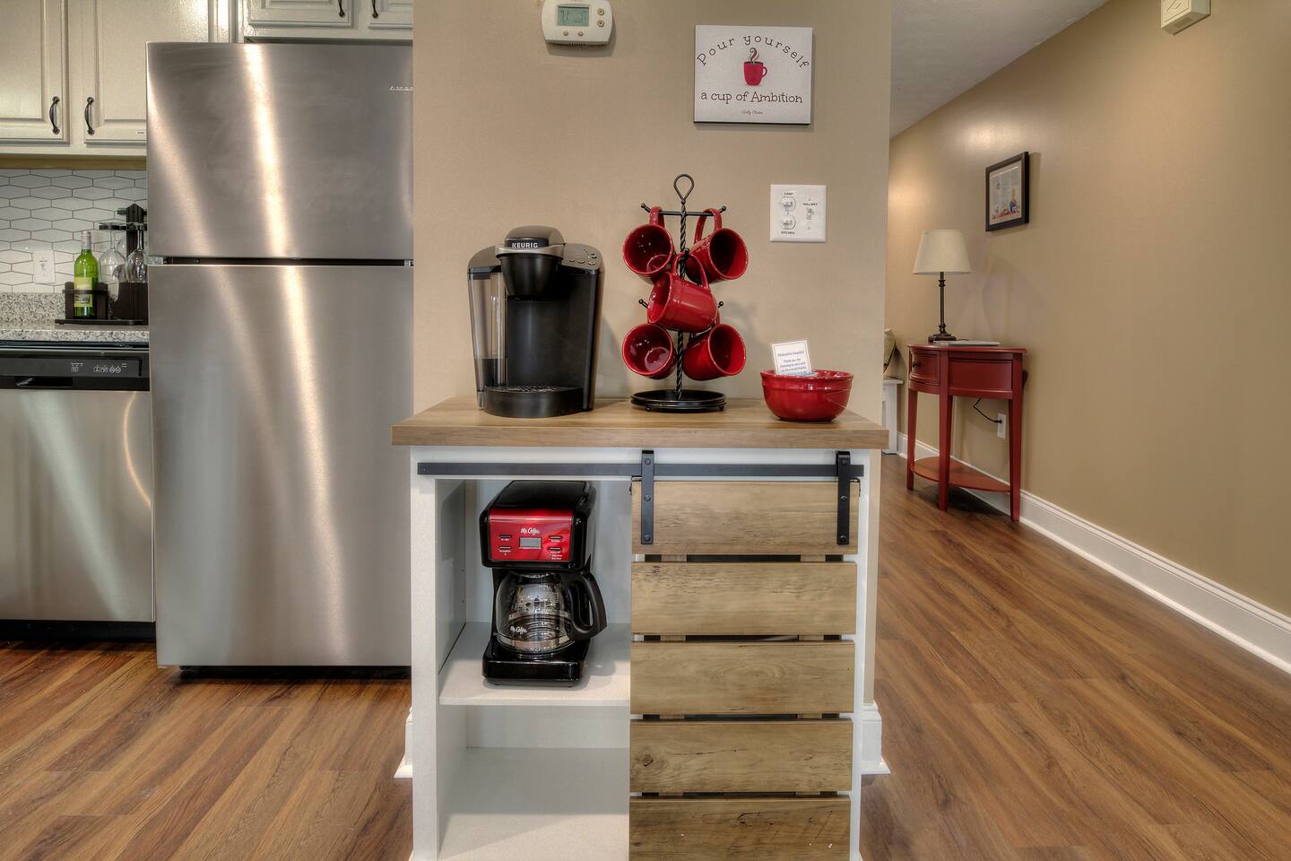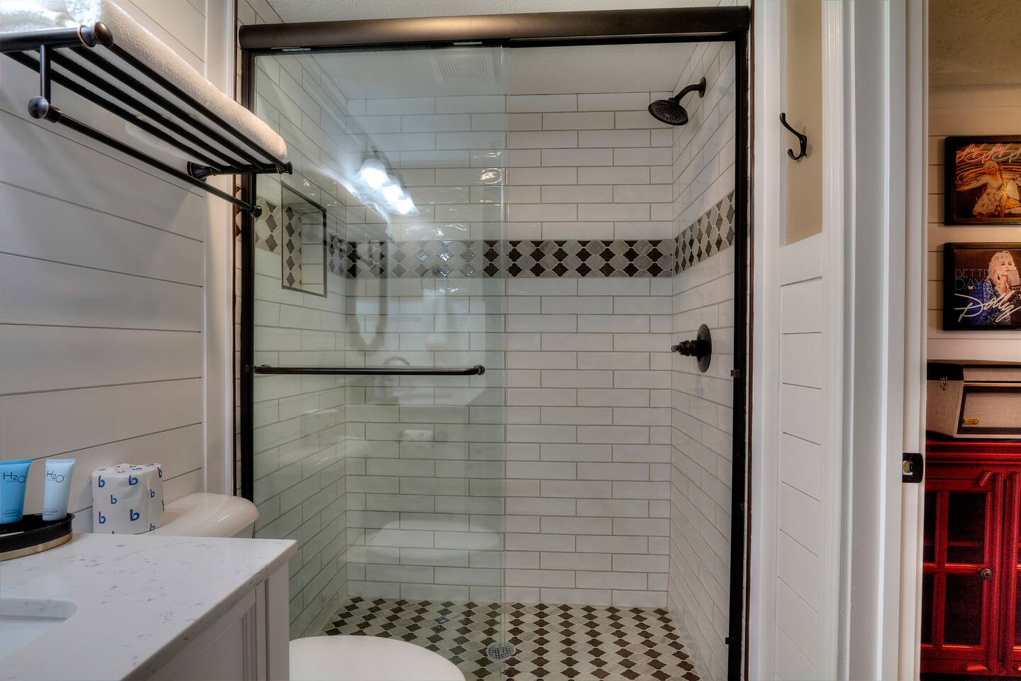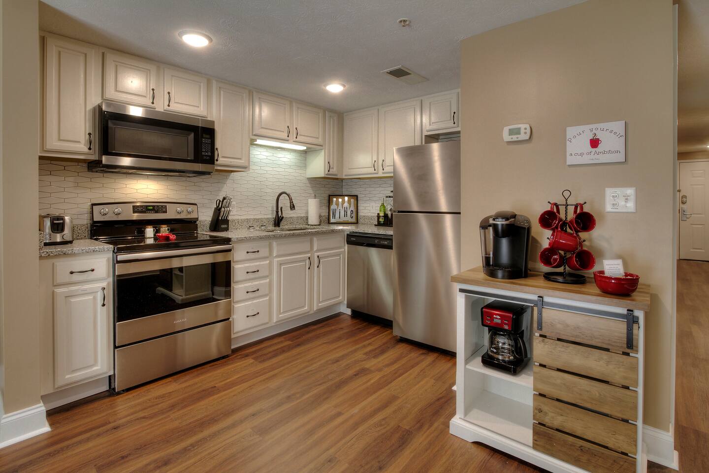 Completely remodeled all new Dolly-inspired Condo in a great location on Dollywood Lane. Close to Dollywood, Ripken, LeConte Center, and everything in Pigeon Forge as well as easy access to Gatlinburg. Fast private high speed internet, HD Cable TV Package. Kitchen: New granite counter-tops, appliances, cabinets. Full-size refrigerator/freezer, icemaker, K-Cup Coffee Maker and regular coffee maker, full size stove/oven, full size dishwasher, microwave, toaster, plates, cups, pots, pans, and all basic cookware. Bedroom: Spacious Bedroom with Queen Bed, Luxury Hybrid Memory Foam mattress(new mattress 11/27/23), ceiling fan, guest closet, 43" HDTV Smart TV, Bluetooth record player to play all your favorite music. Connects to bathroom. Bathroom: Granite counter-top, large tiled shower, with sliding glass doors. Towels, hand towels, wash cloths, make up cloths as well as a basic starter set of Shampoo, Conditioner, Lotion, and soap supplied. Living Room: 55" Smart HDTV with expanded HD Cable. Gorgeous stone fireplace with gas logs. Fold out couch with queen memory fold bed. Private patio off of living room.