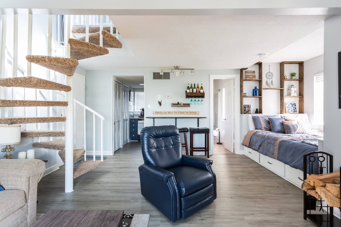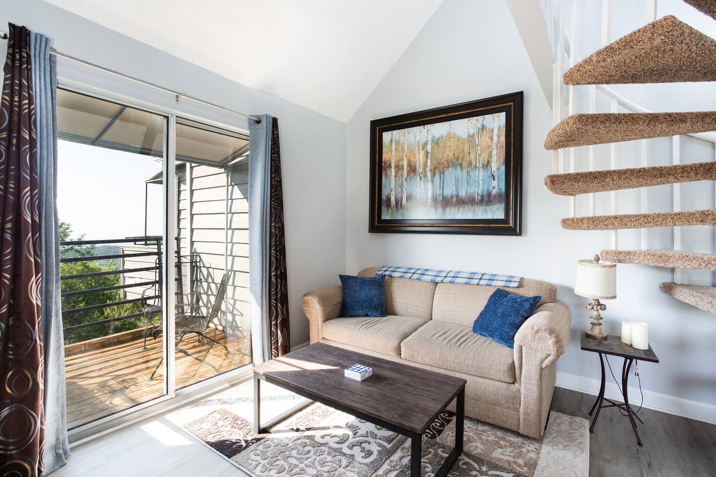 **Brand new Poolhouse now open!! Heated Indoor pool and 2 in-ground hot tubs open daily. Heated outdoor pool also open. Kitchen: Newly remodeled with granite countertops. Full-size refrigerator/freezer, K-Cup Coffee Maker and regular coffee maker, stove/oven, dishwasher, microwave, toaster, plates, cups, pots, pans, and all basic cookware. Living Room: Tall vaulted ceilings with real wood burning fireplace. Comfy couch and recliner. 48" Smart HDTV. Private High-Speed WiFi. Private Balcony off living room with peaceful Valley views. Two chairs with a table to enjoy the views while drinking a glass of wine or your favorite drink. Bathroom: Full Bathtub/Shower. New vanity. Towels, hand towels, wash cloths, as well as a basic starter set of Shampoo, Conditioner, Lotion, and soap supplied. Beds: Queen size alcove bed is tucked away off living room space. Up the spiral staircase in the loft area is a stand alone Queen size bed, HDTV, dresser, and closet. Comfy linens, blankets, and pillows. Location: Gatlinburg Summit is located in a wonderful area that is a very quiet and peaceful setting. While it is atop the mountain in order to have the magnificient views, it is still close to all the action. You are just around the corner from Ober Gatlinburg. You can skip all the Gatlinburg traffic by taking the bypass and arrive quickly and stress free. Downtown Gatlinburg is quickly accessible by 4 different locations to give you plenty of options including Ski Mountain Rd(Light #10), Sugarlands Welcome Center in the National Park(via bypass), Light #3 at Ripley's Aquarium(via Campbell Lead Rd) and the entrance of Gatlinburg(via the bypass). All of these options are just a short 10-15 minute trip. In addition, Pigeon Forge is right down the road via the bypass in about 15-20 minutes. Don't feel like driving much? Take a very short drive to Ober Gatlinburg(less than 2 miles) and ride the scenic Aerial Tram into downtown Gatlinburg. The trams run every 20 minutes so you can return whenever you please.