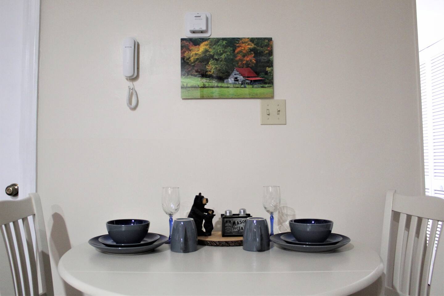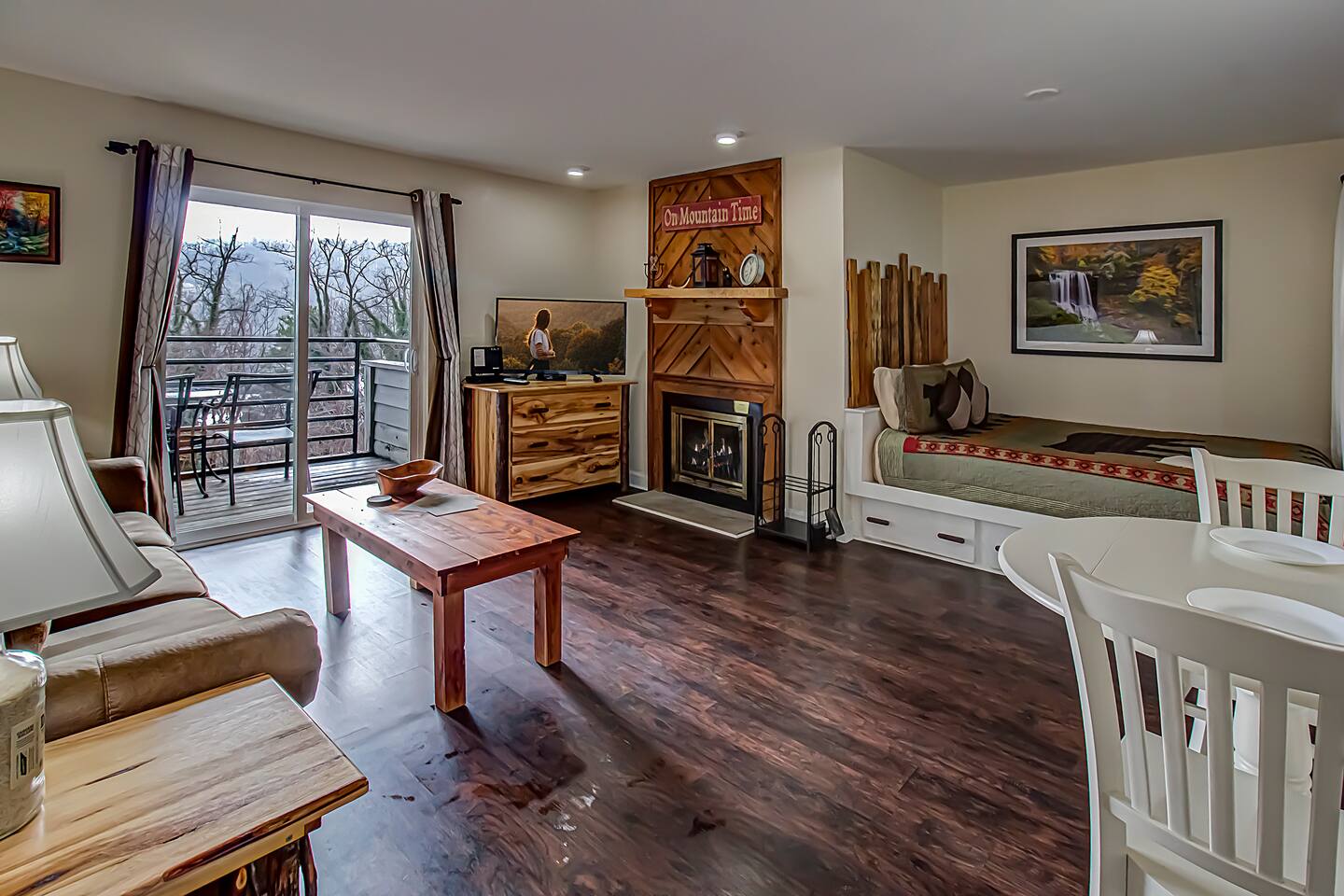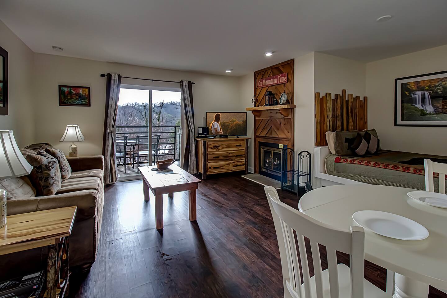 **Brand new Poolhouse now open!! Heated Indoor pool and 2 in-ground hot tubs open daily. Heated outdoor pool also open. 400 square ft. Studio Condominium Kitchen: - granite countertops - stainless steel appliances - Coffee maker-Keurig duo - Toaster - Plates, cups, bowls, silverware, wine glasses, mugs - Pots, pans, pizza pan, basic cookware/silverware - Starter dish soap, dishwasher detergent, and paper towels provided Living Room: - Wood burning fireplace - 42 inch ROKU smart TV with cable television included - Sofa sleeper with fold out queen memory foam mattress and mattress pad (2nd Bed) - Three drawer dresser - Balcony has mosaic glass inlaid table with two chairs and cushions to enjoy view - Dining room table with seating for two - Salt and Pepper shakers on table Bed: ( NEW Hybrid Memory Foam Mattress installed 3/28/23) - Queen Hybrid memory foam mattress with Allerease Ultimate mattress encasement -Linens provided - Queen platform bed includes three built-in drawers for additional storage Restroom: - Full bathtub and shower - vanity, fixtures, and fog-free mirror - Hand towels, wash cloths, bath towels included